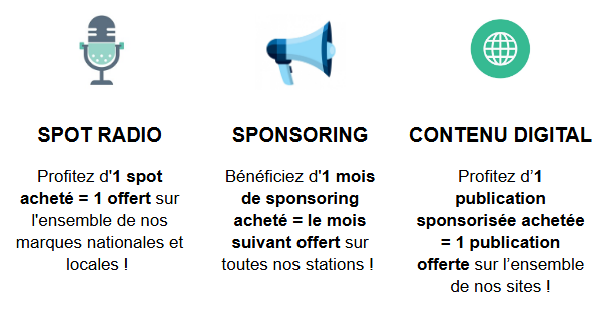 Cette offre vous permet de doubler votre visibilité sur nos marques nationales et locales, sans augmenter votre budget. Plus de spots, plus d’audience, plus d’impact.